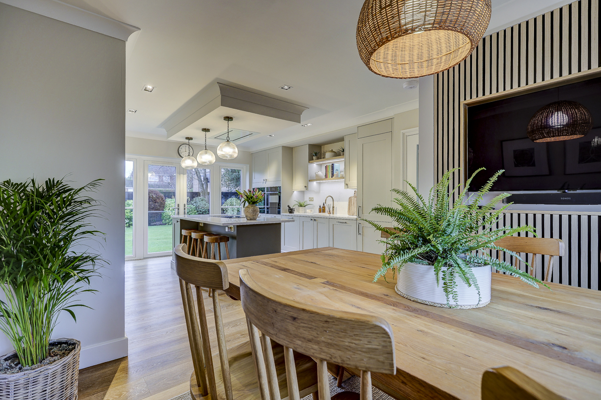 We transformed the space from three separate rooms – the kitchen, dining room and utility – into this fantastic open-plan kitchen/diner. The new layout centres around a generous island with an induction hob and seating, creating a sociable space that works perfectly for both everyday family life and entertaining.